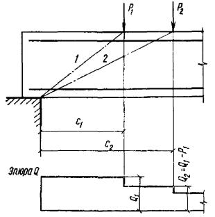 и принимается не менее 0,75Rрbh0 + 2,67p1h0. Значение p1 принимается согласно указаниям п. 3.37. Рис. 15. Расположение невыгоднейших наклонных сечений в плитах с поперечной арматурой только в виде отогнутых стержней При отсутствии хомутов начало наиболее удаленного от опоры отгиба должно располагаться не ближе к опоре, чем то сечение, начиная с которого наклонные сечения будут удовлетворять условиям п. 3.42. Расчет элементов без поперечной арматуры3.42(3.36). Расчет изгибаемых элементов постоянного сечения без поперечной арматуры (см. п. 5.70) производится из условий: а) Qмакс ≤ k2Rрbh0, (64) где Qмакс - максимальная поперечная сила у грани опоры; где c - длина проекции наклонного сечения, проходящего через опору (значение c принимается не более 2h0); Q - поперечная сила в конце рассматриваемого наклонного сечения. k2 и k3 - коэффициенты, принимаемые равными: для оплошных плоских плит - k2 = 2,5 и k3 = 1,5; для балок, ребер, многопустотных настилов - k2 = 2 и k3 = 1,2. При проверке условия (65) в общем случае задаются рядом значений c, равных или меньших 2h0. При действии фиксированных сосредоточенных сил проверка условия (65) производится для наклонных сечений, направленных к точкам приложения сосредоточенных сил (рис. 16). При расчете элемента на действие равномерно распределенной нагрузки p условие (65) можно заменить условием в котором правая часть принимается не менее k1Rрbh0 + 2p1h0, где p1 - см. п. 3.37; k1 - см. п. 3.31; Qмакс - поперечная сила в начале рассматриваемого наклонного сечения. Рис. 16. Расположение невыгоднейших наклонных сечений в элементах без поперечной арматуры 1 - наклонное сечение, проверяемое на действие поперечной силы Q1; 2 - наклонное сечение, проверяемое на действие силы Q2 При действии фиксированной и сплошной нагрузки с линейно-убывающей от опоры интенсивностью также можно вместо условия (65) использовать условие (66), принимая за значение p1 среднюю нагрузку на приопорном участке длиной 2h0, но не более четверти пролета балки или половины вылета консоли. Если оплошная нагрузка линейно возрастает от опоры, начиная с нулевой интенсивности, то прочность проверяется из условия