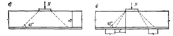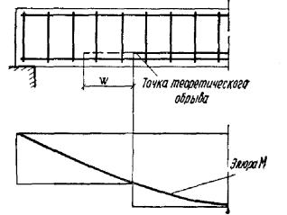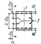 M ≤ RаFаz + 0,5qхw2c2 + (qхw1 - qхw2)l1(c - l1/2), (74а) где qхw1 и qхw2 - интенсивность хомутов соответственно у начала наклонного сечения в растянутой зоне и у конца наклонного сечения; l1 - длина участка с интенсивностью qхw1 в пределах длины c (рис. 19). 3.48. Проверку наклонных сечений по изгибающему моменту согласно пп. 3.45 - 3.47 для элементов с постоянной или плавно меняющейся высотой, допускается не производить в следующих случаях: 1) если растянутую продольную арматуру можно учитывать с полным расчетным сопротивлением, т.е. если на концах арматуры имеются надежные анкеры (см. п. 5.49) или если при отсутствии анкеров наклонное сечение пересекает продольную арматуру вне зоны анкеровки (т.е. при lх > lан), при этом должны выполняться требования пп. 3.49 и 3.50; Рис. 19. Изменение интенсивности хомутов в пределах длины проекции наклонного сечения c Рис. 20. Обрыв растянутых стержней в пролете 2) для крайних свободных опор балок, если выполняются условие (47) п. 3.31 или указания пп. 3.42 и 3.43. В остальных случаях расчет наклонных сечений по изгибающему моменту обязателен. При этом, если условие (70) не удовлетворяется при поперечной арматуре, установленной исходя из расчета прочности по поперечной силе или из расчета по раскрытию наклонных трещин, рекомендуется в первую очередь принимать меры по усилению анкеровки продольной арматуры или усиливать поперечное армирование у начала наклонного сечения в растянутой зоне. 3.49(3.40). Для обеспечения прочности наклонных сечений на действие изгибающего момента в элементах постоянной высоты продольные растянутые стержни, обрываемые в пролете, должны заводиться за точку теоретического обрыва (т.е. за нормальное сечение, в котором эти стержни перестают требоваться по расчету) (рис. 20) на длину не менее 20d и не менее величины w, определяемой по формуле: где Q - поперечная сила в нормальном сечении, проходящем через точку теоретического обрыва стержня; α - то же, что в п. 3.32; d - диаметр обрываемого стержня; qхw - см. п. 3.47. Кроме того, должны быть учтены требования п. 5.48. Для элементов без хомутов, нагруженных равномерно распределенной сплошной нагрузкой, значение w принимается равным h0. 3.50. Для обеспечения прочности наклонных сечений на действие изгибающего момента начало отгиба в растянутой зоне должно отстоять от нормального сечения, в котором отгибаемый стержень полностью используется по моменту, не менее чем на h0/2, а конец отгиба должен быть расположен не ближе того нормального сечения, в котором отгиб не требуется по расчету. Расчет наклонных сечений в подрезках3.51. Для элементов с резко меняющейся высотой сечения, например для балок или консолей, имеющих подрезки, производится расчет по поперечной силе для наклонных сечений, проходящих у опоры консоли, образованной подрезкой (рис. 21), согласно указаниям пп. 3.32 - 3.41; при этом в расчетные формулы вводится рабочая высота h01 короткой консоли, образованной подрезкой. Рис. 21. Невыгоднейшие наклонные сечения в элементе с подрезкой 1 - при расчете по поперечной силе; 2 - при расчете по изгибающему моменту Хомуты, необходимые для обеспечения прочности наклонного сечения в подрезке, следует устанавливать на длине не менее l1 = Q1/qх + u за конец подрезки и не менее w0, определяемой по формуле (76). 3.52. Для элементов с подрезками должен производиться расчет на действие изгибающего момента в наклонном сечении, проходя