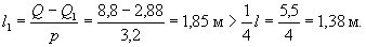 Так как интенсивность хомутов qх2 не удовлетворяет условию (50), минимальную длину участка с шагом хомутов u1 = 15 см определяем по формуле (58) с заменой Qх.б2 на Q1 = 0,6Rрbh0 = 2,88 тс: