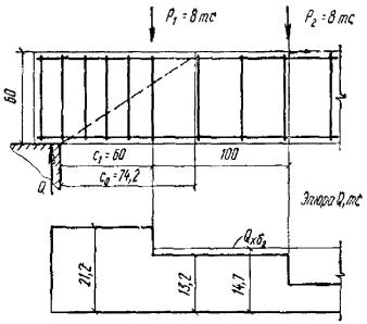 т.е. в пределах невыгоднейшего сечения действует сосредоточенная сила P1 = 8 тс. Согласно п. 3.37 требуемую интенсивность хомутов можно уменьшить, определяя ее по формуле (56) при Q = Qмакс - P1 или из условия (57). По формуле (56)