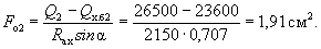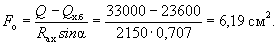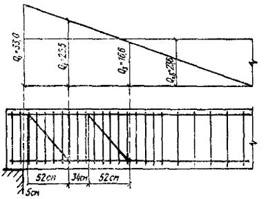 Принимаем Fо = 6,28 см2 (2Æ20). Расстояние от опоры до верхнего конца первого отгиба принимаем равным 5 см (см. п. 5.75). Тогда поперечная сила в сечении, проходящем через нижний конец первого отгиба, равна (см. рис. 23): Q2 = 33(290 - 5 - 52)/290 = 26,5 тс. Требуемую площадь сечения отогнутой арматуры во второй от оси опоры плоскости отгибов найдем по формуле
