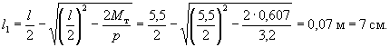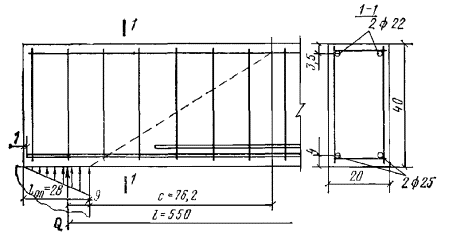 Определяем расположение начала невыгоднейшего наклонного сечения, т.е. расположение нормального сечения, в котором M = pll1/2 - pl12/2 = Mт. Поскольку μ = Fа/(bh0) = 9,82/(20·36) ≈ 0,0014 < 0,15, момент трещинообразования Mт определяем, согласно пп. 4.3 и 4.4, принимая Nус = 0 и Fа = F'а = 0: Mт = RрWт = Rр·0,292bh2 = 6,5·0,292·20·402 = 60700 кгс·см = 0,607 тс·м. Решая вышеприведенное квадратное уравнение, находим расстояние l1 от равнодействующей опорной реакции до сечения, в котором M = Mт: