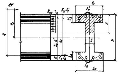 (см. табл. 17), следовательно, сжатой арматуры не требуется. По табл. 18 при A0 = 0,42 находим ξ = 0,6. Тогда Fа = [ξbh0 +(b'п - b)h'п]Rпр/Rа = [0,6·20·54 + (40 - 20)12]75/3400 = 19,6 см2. Принимаем 4Æ25 (Fа = 19,64 см2). Пример 8. Дано: размеры сечения b'п = 40 см; h'п = 10 см; b = 20 см; h = 60 см; a = 7 см; бетон марки М 300 (Rпр = 115 кгс/см2 при mб1 = 0,85); растянутая арматура класса А-III (Rа = 3400 кгс/см2) с площадью сечения Fа = 19,64 см2 (4Æ25); F'а = 0; расчетный изгибающий момент M = 25 тс·м. Требуется проверить прочность сечения. Расчет. h0 = 60 - 7 = 53 см. Проверку прочности сечения производим согласно п. 3.21. Так как RаFа = 3400·19,64 = 66800 кгс > Rпр b'пh'п = 115·40·10 = 46000 кгс, то граница сжатой зоны проходит в ребре, и прочность сечения проверяем из условия (28). Для этого по формуле (29) определяем высоту сжатой зоны x: