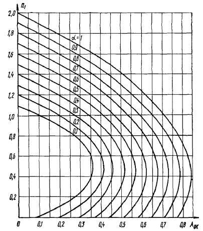 Если условие (41) не соблюдается, расчет сечения следует производить последовательными приближениями, заменяя в формуле (37) для каждого растянутого стержня величину Rа значениями напряжений, равными σаi = s(ξ0/ξi - 1)Rа, но не более Rа, где s и ξ0 - см. табл. 17; при этом уточняют положение осей x и y, проводя их через точку приложения равнодействующей усилий в растянутых стержнях. При проектировании конструкций не рекомендуется допускать превышение значений ξi над ξR более чем на 20 %. При выполнении этой рекомендации допускается производить только один повторный расчет с заменой в формуле (37) значений Rа для растянутых стержней, где ξi > ξR, на напряжения, равные При повторном расчете значение x определяется по формуле (39) независимо от расположения растянутых стержней. Если выполняются условия: для прямоугольных и тавровых сечений с полкой в сжатой зоне x > h, (43) для двутавровых и тавровых сечений с полкой в растянутой зоне x > h - hп - bсв.рtgγ (44) (где hп и bсв.р - высота и ширина наименее растянутого свеса полки, см. рис. 8), то расчет на косой изгиб производится согласно п. 3.28. При использовании формул настоящего пункта за растянутую арматуру площадью Fа допускается принимать арматуру, располагаемую вблизи растянутой грани, параллельной оси y, а за сжатую арматуру площадью F'а - арматуру, располагаемую вблизи сжатой грани, параллельной оси y, но по одну, наиболее сжатую сторону от оси x (см. рис. 6). Рис. 8. Тавровое сечение со сжатой зоной, заходящей в наименее растянутый свес полки 1 - плоскость действия изгибающего момента 3.26. Определение требуемого количества растянутой арматуры при косом изгибе для элементов прямоугольного, таврового и Г-образного сечения с полкой в сжатой зоне может производиться при помощи графика на рис. 9. Для этого ориентировочно задаются положением центра тяжести сечения растянутой арматуры. Затем по графику определяют величину α в зависимости от значений: