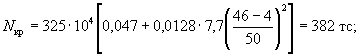 где 10W0 = 10bh2/6 = 10·115·302/6 = 1,73·105 кгс·см; kд = 1,5Mт/Mп = 1,5·3,45/3,7 = 1,4; kб = kнkд = 0,61·1,4 = 0,855. С учетом коэффициента kб расчетная ширина раскрытия трещин равна aт = 0,23·0,855 = 0,197 мм < 0,2 мм, т.е. ширина раскрытия трещин меньше предельно допустимой. Пример 53. Дано: железобетонная колонна промышленного здания с размерами поперечного сечения: h = 50 см; b = 40 см; a = a' = 5 см; бетон марки М 200 (RрII = 11,5 кгс/см2, Eб = 2,15·105 кгс/см2); рабочая арматура класса А-III (Eа = 2·106 кгс/см2) площадью сечения Fа = F'а = 12,32 см2 (2Æ28); продольная сжимающая сила N = 50 тс; момент от полной нагрузки Mп = 24 тс·м, в том числе момент от постоянных и длительных нагрузок Mдл = 15 тс·м. Требуется рассчитать колонну по раскрытию трещин. Расчет. h0 = h - a = 50 - 5 = 45 см. Определяем необходимость расчета по раскрытию трещин. Для этого проверяем условие (221). Так как μ = Fа/(bh0) = 12,32/(40·45) = 0,0069 < 0,01, то, согласно п. 4.3, момент образования трещин и величину rу находим как для бетонного сечения. Согласно формуле (233), Mт = 0,292bh2RрII = 0,292·40·502·11,5 = 3,37 тс·м. Величина rу для элемента прямоугольного сечения в соответствии с формулой (228) равна rу = 0,8h/6 = 0,8·50/6 = 6,67 см. Эксцентрицитет силы N относительно центра тяжести сечения при действии момента Mп равен e0 = Mп/N = 24·105/50·103 = 48 см; N(e0 - rу) = 50000(48 - 6,67) = 20,67 тс·м > 3,37 тс·м, т.е. элемент работает с трещинами в растянутой зоне. Согласно п. 4.6, необходимо проверить длительное и кратковременное раскрытие трещин. Значение aт при длительном действии нагрузки находим по формуле (236). Для этого вычисляем напряжение в арматуре σа, используя формулу (249): eа = h/2 - a + Mдл/N = 50/2 - 5 + 15·105/(50·103)= 50 см; μn = μ