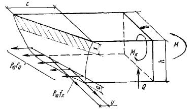 где Qх и Qу - составляющие поперечной силы, действующие соответственно в плоскости симметрии x и в нормальной к ней плоскости y; Qх.б(х) и Qх.б(у) - предельные поперечные силы, которые могут быть восприняты наклонным сечением при действии их соответственно только в плоскости x и только в плоскости y, определяемые по формулам: