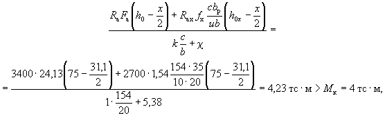 Принимаем 3Æ28 (Fа = 18,47 см2). Пример 2. Дано: размеры сечения b = 30 см; h = 80 см; a = 7 см; растянутая арматура класса А-III (Rа = 3400 кгс/см2) с площадью поперечного сечения Fа = 29,45 см2 (6Æ25); mб1 = 0,85 (нагрузки с малой суммарной длительностью отсутствуют); бетон марки М 300 (Rпр = 115 кгс/см2); расчетный изгибающий момент M = 55 тс·м. Требуется проверить прочность сечения. Расчет. h0 = 80 - 7 = 73 см. Проверку прочности сечения производим согласно п. 3.18. Определяем значение x: