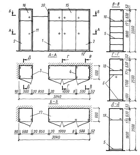 3. Настоящий Сборник содержит укрупненные расценки и укрупненные сметные нормы на устройство встроенных шкафов и антресолей, выполненных по серии 1.172.5-6. 4. Укрупненные расценки предусматривают устройство: шкафов однопольных при ширине дверных блоков 400, 450 и 500 мм и двупольных при ширине дверных блоков 800, 900 и 1000 мм, высотой 1780, 2080 мм (включая цоколь-плинтус) с двумя, пятью и шестью полками и одной боковой стенкой; кроме того, в Сборнике даны нормы и расценки на установку переставной полки шкафа, задней стенки с цоколем и боковой или промежуточной стенок; антресолей высотой 420, 440 и 470 мм однопольных при ширине дверных блоков 400, 450 и 500 мм и двупольных при ширине дверных блоков 800, 900 и 1000 мм. 5. По расценкам с УР-10-83 по УР-10-94 и с УР-10-99 по УР-10-104 при необходимости следует определять дополнительно затраты на установку задней и боковой стенок антресоли с наличниками. 6. При высоте антресолей, отличной от принятых в укрупненных расценках, необходимо применять поправки. 7. Укрупненными расценками не учтена стоимость приведенных в прил. 1 материальных ресурсов. 8. Показатели прямых затрат по территориальным районам учитывают затраты на основную заработную плату рабочих и заработную плату рабочих, обслуживающих машины, без районных и других коэффициентов к заработной плате, которые следует учитывать в локальных сметах (сметных расчетах). 9. Накладные расходы и плановые накопления укрупненными расценками не учтены и начисляются в установленном при составлении смет и сметных расчетах порядке. 10. Пример определения стоимости установки шкафа приведен в прил. 2. 11. В нормах и расценках приняты измерители: 100 м2 вертикальной проекции шкафа, 100 м2 горизонтальной проекции антресоли. Площадь вертикальной проекции шкафа определяется произведением его высоты (с учетом цоколя) на ширину, 1,78×0,4 = 0,712 м2. Площадь горизонтальной проекции антресоли определяется произведением ее глубины на ширину, 0,45×0,8 = 0,36 м2.