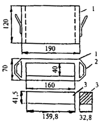 5.1.2 Для определения слеживаемости холодных смесей используют цилиндрические формы диаметром 71,4 мм, высотой 60 мм. Форма снабжена нижним и верхним вкладышами: в центре нижнего вкладыша укреплен стальной стержень, верхний вкладыш имеет в центре сквозное отверстие. Приспособление для уплотнения образца из холодных смесей и размеры образца указаны на рисунке 3. 1 - подставки; 2 - нижний вкладыш формы; 3 - стальной стержень; 4 - цилиндрическая форма; 5 - образец; 6 - верхний вкладыш формы; 7 - сквозное отверстие; 8 - груз. Рисунок 3 - Приспособление для уплотнения образцов из холодных смесей для определения слеживаемости 5.1.3 Для определения предела прочности на растяжение при изгибе укрепленных грунтов используют формы для изготовления образцов в виде призм квадратного сечения, размеры которых для разных грунтов указаны в таблице 4 и на рисунке 4. Таблица 4 В миллиметрах