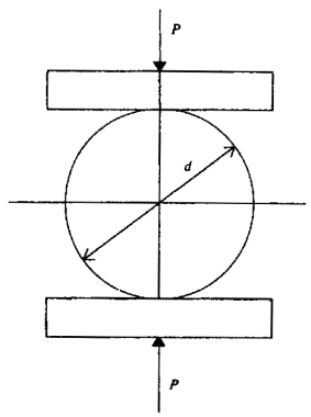 где Р - разрушающая нагрузка, Н; F - первоначальная площадь поперечного сечения образца, см2; 10-2 - коэффициент пересчета в МПа. За результат определения принимают округленное до первого десятичного знака среднеарифметическое значение испытаний трех образцов. 16 Определение предела прочности на растяжение при расколеСущность метода заключается в определении нагрузки, необходимой для раскалывания образца по образующей. (Измененная редакция, Изм. № 1). 16.1 Средства контроля и вспомогательное оборудованиеСредства контроля и вспомогательное оборудование - по п. 15.1. 16.2 Порядок подготовки к проведению испытанияДля испытания готовят образцы по п. 6.1 и 6.2. Перед испытанием образцы термостатируют при заданной температуре (0±2) °С в течение не менее 1 ч в воде. Температуру (0±2) °С создают смешением воды со льдом. 16.3 Порядок проведения испытанияПредел прочности на растяжение при расколе образцов определяют на прессах при заданной постоянной скорости движения плиты пресса (50±1) мм/мин. (Измененная редакция, Изм. № 1). При использовании гидравлических прессов требуемую скорость перед проведением испытания следует установить при холостом ходе поршня. Образец, извлеченный из сосуда для термостатирования, устанавливают в центре нижней плиты пресса на боковую поверхность (рисунок 7), затем опускают верхнюю плиту и останавливают ее выше уровня поверхности образца на 1,5-2 мм. Это может быть достигнуто соответствующим подъемом нижней плиты пресса. После этого включают электродвигатель пресса и начинают нагружать образец. Максимальное показание силоизмерителя принимают за разрушающую нагрузку. Рисунок 7 - Схема испытания образцов на растяжение при расколе 16.4 Обработка результатов испытанияПредел прочности на растяжение при расколе Rp МПа, вычисляют по формуле