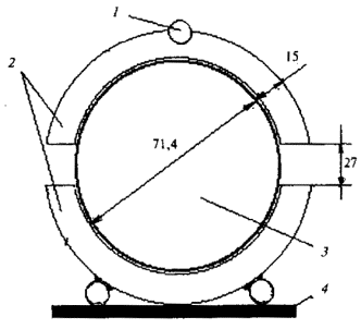 где g6- масса насыщенного водой образца, взвешенного в воде, г. За результат определения набухания принимают округленное до первого десятичного знака среднеарифметическое значение трех определений. 15 Определение предела прочности при сжатииСущность метода заключается в определении нагрузки, необходимой для разрушения образца при заданных условиях. 15.1 Средства контроля и вспомогательное оборудованиеПрессы механические или гидравлические по ГОСТ 28840 с нагрузками от 50 до 100 кН (5-10 тc) и до 500 кН (50 тc) с силоизмерителями, обеспечивающими погрешность не более 2 % измеряемой нагрузки. Термометр химический ртутный стеклянный с ценой деления шкалы 1 °С по ГОСТ 400. Сосуды для термостатирования образцов вместимостью от 3 до 8 л (в зависимости от размера и количества образцов). 15.2 Порядок подготовки к проведению испытанияДля испытания готовят образцы по 6.1 и 6.2. Перед испытанием образцы термостатируют при заданной температуре: (50±2) °С, (20±2) °С или (0±2) °С. Температуру (0±2) °С создают смешением воды со льдом. Образцы из горячих смесей выдерживают при заданной температуре в течение 1 ч в воде. Образцы из смесей с жидкими и эмульгированными битумами термостатируют в воздушной среде в течение 2 ч, при этом образцы из укрепленных грунтов упаковывают в полиэтиленовые пакеты. Для определения предела прочности при сжатии образцов в водонасыщенном состоянии используют образцы, испытанные в соответствии с разделом 13. Насыщенные водой образцы после взвешивания на воздухе и в воде снова помещают в воду с температурой (20±2) °С, а перед испытанием вытирают мягкой тканью или фильтровальной бумагой. 15.3 Порядок проведения испытанияПредел прочности при сжатии образцов определяют на прессах при скорости движения плиты пресса (3,0±0,3) мм/мин. При использовании гидравлических прессов эту скорость перед проведением испытания следует установить при холостом ходе поршня. Рисунок 6 - Шарнирное устройство Образец, извлеченный из сосуда для термостатирования, устанавливают в центре нижней плиты пресса, затем опускают верхнюю плиту и останавливают ее выше уровня поверхности образца на 1,5-2 мм. Это же может быть достигнуто соответствующим подъемом нижней плиты пресса. После этого включают электродвигатель пресса и начинают нагружать образец. Для повышения точности определения предела прочности при сжатии рекомендуется использовать шарнирное устройство (рисунок 6), состоящее из шарика 1 и двух металлических пластин 2, которое устанавливают на верхний торец образца 4, накрытый прокладкой из бумаги 3. Шарнирное устройство обеспечивает равномерное распределение нагрузки по всей площади торца образца в случае непараллельности оснований образца. Максимальное показание силоизмерителя принимают за разрушающую нагрузку. 15.4 Обработка результатов испытанияПредел прочности при сжатии Rсж, МПа, вычисляют по формуле