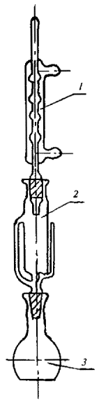 Среднеарифметическое значение потери прочности при сжатии вычисляют по трем образцам, при этом расхождение между результатами испытания отдельных образцов не должно превышать ±10%. 23 Определение состава смесиСущность методов заключается в определении содержания вяжущего и зернового состава минеральной части смеси. 23.1 Метод экстрагирования вяжущегоМетод предусматривает определение содержания вяжущего путем экстрагирования его из смеси в специальных приборах-экстракторах с помощью растворителей. 23.1.1 Средства контроля и вспомогательное оборудование Весы лабораторные по ГОСТ 24104 4-го класса точности. Прибор - аппарат типа Сокслет, состоящий из колбы, обратного холодильника и насадки стеклянной лабораторной для экстрагирования по ГОСТ 23932. Баня песчаная. Шкаф сушильный. Чашка фарфоровая по ГОСТ 9147. Баня водяная. Бумага фильтровальная по ГОСТ 12026. Вата по ГОСТ 5556. Растворители: хлороформ по ГОСТ 20015, спиртхлороформ (20 % спирта по ГОСТ 17299, 80 % хлороформа), спирт-бензол (20 % спирта, 80 % бензола по ГОСТ 5955), четыреххлористый углерод по ГОСТ 20288, трихлорэтилен по ГОСТ 9976 и др. 23.1.2 Порядок подготовки к проведению испытания Пробу смеси берут из смесителя или из разогретой и тщательно перемешанной вырубки: для песчаных смесей - 100 г, мелкозернистых и крупнозернистых - 500 г. Из трех-четырех слоев фильтровальной бумаги готовят цилиндрический патрон диаметром не более диаметра горла экстракционной насадки. Патрон с одной стороны закрепляют (завязывают), высушивают вместе с небольшим кусочком ваты в сушильном шкафу до постоянной массы и взвешивают. Патрон наполняют смесью, закрывают ватой, снова взвешивают с точностью до 0,01 г и помещают в экстракционную насадку 2 (рисунок 11). Патрон, заложенный в насадку, должен быть не менее чем на 1 см ниже уровня сифона. К верхней части насадки присоединяют холодильник 7, а к нижней - колбу с растворителем 3. Рисунок 11 - Аппарат типа Сокслет 23.1.3 Порядок проведения испытания Колбу с растворителем нагревают на песчаной бане до температуры кипения растворителя. Конденсирующиеся в холодильнике пары растворителя, непрерывно стекая на смесь, растворяют вяжущее и извлекают его из смеси. После заполнения экстрактора растворитель переливают в колбу по сифонной трубке. Извлечение вяжущего продолжают до исчезновения окраски растворителя, собирающегося в экстракционной насадке. Извлеченный из насадки патрон высушивают в сушильном шкафу при температуре 50-60 °С до постоянных результатов взвешивания. Если наиболее мелкие частицы минерального материала смеси проходят в экстракт, то его нужно осторожно слить из колбы в чашку и остаток промыть новым количеством растворителя до исчезновения окраски и высушить. Количество мелких частиц, прошедших через гильзу, определяют как разность между массой чашки с остатком и массой пустой чашки. Вычисленную массу мелких частиц прибавляют к массе минерального остатка, полученного после извлечения вяжущего. 23.1.4 Обработка результатов испытания Массовую долю вяжущего в смеси qв %, вычисляют с точностью до первого десятичного знака по формулам: при дозировке вяжущего, включенного в 100 % состава смеси