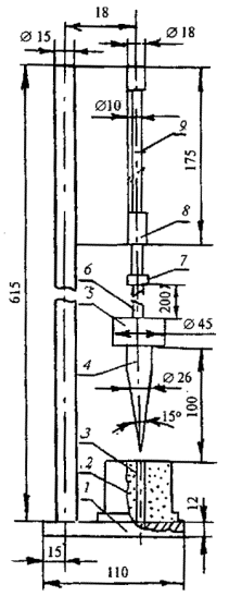 Расхождение между результатами параллельных определений по абсолютной величине не должно превышать, %: 0,2 - для вяжущего; 0,3 - для зерен мельче 0,071 мм; 1 - для зерен крупнее 0,071 мм. 24 Определение сцепления вяжущего с минеральной частью смесиСцепление оценивают визуально по величине поверхности минерального материала, сохранившей пленку вяжущего после кипячения в водном растворе поваренной соли. 24.1 Средства контроля и вспомогательное оборудованиеВесы лабораторные по ГОСТ 24104 4-го класса точности. Стаканы химические термостойкие по ГОСТ 23932 вместимостью не менее 500 см3. Сетки металлические диаметром на 5-10 мм меньше диаметра химического стакана с размером отверстий 0,071-0,16 мм по ГОСТ 6613. Электроплитка, баня песчаная или горелка газовая. Сетка асбестовая. Вода дистиллированная по ГОСТ 6709. Соль поваренная по ГОСТ 13830. Бумага фильтровальная по ГОСТ 12026. 24.2 Порядок подготовки к проведению испытанияОт средней пробы смеси, приготовленной в лаборатории или на асфальтосмесительной установке, берут две навески по 50 г. Одну навеску помещают на сетку 2 (рисунок 12), вторую - оставляют для последующего сравнения со смесью, прошедшей испытание. Рисунок 12 - Схема испытания для определения сцепления вяжущего с минеральной частью смеси 24.3 Порядок проведения испытанияХимический стакан 7 заполняют примерно на 2/3 объема 15%-ным раствором поваренной соли в дистиллированной воде, устанавливают на электроплитку, песчаную баню или над пламенем горелки и доводят до кипения. Сетку с навеской смеси опускают в стакан с кипящим раствором таким образом, чтобы уровень раствора 4 над смесью был не менее 30-40 мм, и укрепляют проволочными дужками 3 за край стакана. При испытании смеси с вязким вяжущим сетку с испытуемым образцом выдерживают в кипящем растворе 30 мин, с жидким - 3 мин. Кипение не должно быть бурным. Вяжущее, отделившееся от поверхности минеральных зерен в процессе кипения и всплывшее на поверхность, удаляют фильтровальной бумагой. По истечении указанного времени сетку со смесью извлекают из стакана и переносят в стакан с холодной водой для охлаждения и для того, чтобы удалить соль, осевшую на частицах смеси при кипячении, после чего смесь переносят на фильтровальную бумагу для испарения воды. Сцепление оценивают после полного испарения воды из смеси. 24.4 Обработка результатов испытанияСмесь считают выдержавшей испытание, если после кипячения не менее 3/4 поверхности остается покрытой пленкой вяжущего. 25 Определение слеживаемости холодных смесейСущность метода заключается в оценке способности холодной смеси не слеживаться при хранении в штабеле. 25.1 Средства контроляПрибор (рисунок 13) состоит из основания с подставкой 1 для образца 2, с отверстием 3, штанги 6 и направляющей втулки 8. Во втулке свободно перемещается штанга с навинченным на нее конусным наконечником 4. Рисунок 13 - Прибор для определения слеживаемости Масса штанги с наконечником - (500±5) г. Угол в вершине конуса - (15,0±0,5)°. По штанге свободно перемещается цилиндрический груз 5 массой (500±5) г. Высота подъема груза на штанге ограничена вверху упорным кольцом 7 и составляет (200±2) мм. В центре основания имеется отверстие для предохранения острия конуса от затупления. Для фиксации момента касания острия конуса нижней подставки в верхней части штанги нанесена риска 9. 25.2 Порядок подготовки к проведению