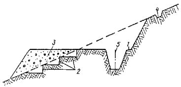 Рис. 1. Схема поперечного разреза полки: 1 - полувыемка; 2 - уступы для устойчивости полунасыпи; 3 - полунасыпь; 4 - нагорная водоотводная канава; 5 -траншея для трубопровода