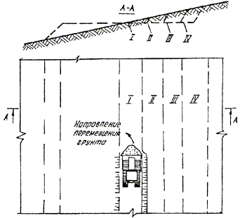 Рис. 3. Схема разработки полок на склонах продольными проходами бульдозера: I, II, III, IV - призмы разработанного грунта. При больших объемах земляных работ допускается использовать два бульдозера, разрабатывающие полки с двух сторон продольными проходами навстречу друг другу. 4.24. На участках с поперечным уклоном более 15° для разработки разрыхленного или нескального грунта при устройстве полок следует применять одноковшовые экскаваторы, оборудованные прямой лопатой. Экскаватор разрабатывает грунт в пределах полувыемки и отсыпает его в насыпную часть полки (рис. 4). В процессе первоначальной разработки полки его необходимо якорить бульдозером или трактором. Окончательная доработка и планировка полки производится бульдозером.