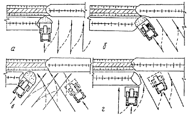 Рис. 7. Схемы производства работ по засыпке уложенного трубопровода бульдозером: а - прямолинейными проходами; б - косопоперечными параллельными проходами; в - косоперекрестными проходами; г - комбинированным способом. 4.53. При наличии горизонтальных кривых на трубопроводе вначале должен засыпаться криволинейный участок, а затем остальная часть. Засыпка криволинейного участка начинается с его середины движением поочередно к его концам. 4.54. На участках местности с вертикальными кривыми трубопровода (в оврагах, балках, на холмах и т.п.) засыпку следует производить сверху вниз. 4.55. После засыпки на нерекультивируемых землях над трубопроводом устраивают валик грунта в виде правильной призмы в соответствии со СНиП по магистральным трубопроводам. На рекультивируемых землях в теплое время года после засыпки трубопровода минеральным грунтом производят его уплотнение пневмокатками или гусеничными тракторами. Уплотнение минерального грунта должно выполняться до заполнения трубопровода транспортируемым продуктом. 4.56. Предоставляемые во временное пользование земельные участки после окончания строительства трубопровода должны быть восстановлены в соответствии с проектом. 4.57. Полоса отвода земель на лесных участках по окончании строительства должна быть очищена от пней, других древесных остатков и спланирована. 4.58. Рекультивация строительной полосы после засыпки магистральных трубопроводов должна осуществляться в процессе строительства трубопроводов в сроки, устанавливаемые органами, предоставляющими земельные участки в пользование в соответствии с проектами. 4.59. В проекте рекультивации земель в соответствии с условиями предоставления земельных участков в пользование и с учетом местных природно-климатических особенностей должны быть определены: площади по трассе трубопровода, на которых необходимо проведение технической и биологической рекультивации; объем снимаемого плодородного слоя почвы; место расположения отвала для временного хранения снятого плодородного слоя почвы; допустимое превышение нанесенного плодородного слоя почвы над уровнем ненарушенных земель; объем и способы погрузки и вывозки лишнего минерального грунта после засыпки трубопровода; стоимость работ по технической и биологической рекультивации. 4.60. Возвращение плодородного слоя почвы следует выполнять бульдозерами, перемещающими его из отвала хранения, распределяющими и выполняющими окончательную планировку продольными проходами. 4.61. Снятие плодородного слоя почвы должно выполняться роторным экскаватором. Допускается выполнять операции по снятию плодородного слоя почвы в не мерзлом состоянии продольными проходами бульдозеров на ширину ножней, но не менее 3,5 м для трубопроводов диаметром до 820 мм и с последующим расширением этой полосы до 8 м для трубопроводов диаметром 1020-1420 мм. 4.62. Плодородный слой почвы мощностью менее 20 см в не мерзлом состоянии должен сниматься продольными проходами бульдозеров. При этом ширину полосы рекультивации следует принимать на 1 м больше, чем при использовании роторного экскаватора. Для снятия плодородного слоя почвы в мерзлом состоянии следует использовать роторные экскаваторы. 4.63. На участках, где ширина верха траншей, выемок и насыпей превышает 3,5 м (углы поворота; подходы к переходам; крановые 