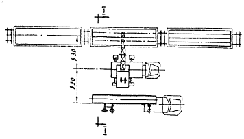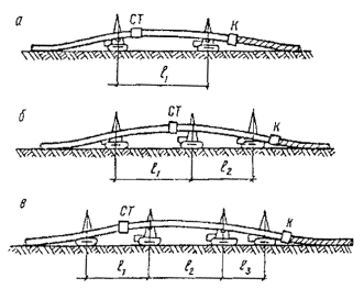 Рис. 10. Схемы расстановки трубоукладчиков и машин в изоляционно-укладочной колонне при совмещенном способе производства работ для трубопроводов различных диаметров: а - 529-820 мм; б - 1020 мм; в - 1220 мм; г - 1420 мм; СТ - сушильная установка; К - комбайн для очистки и изоляции трубопровода; l1, l2 - расстояния между трубоукладчиками и группами трубоукладчиков 4.114. Раздельный способ производства изоляционно-укладочных работ следует применять на участках с холмистым рельефом местности, а также при строительстве трубопроводов, имеющих низкую сопротивляемость действию монтажных нагрузок. Схемы размещения механизмов в изоляционной колонне при использовании очистной и изоляционной машин приведены на рис. 11; при использовании комбайна - на рис. 12. Расстояния между трубоукладчиками и группами трубоукладчиков приведены в табл. 3. 4.115. При выполнении укладочных работ следует применять только такие средства малой механизации, которые исключают возможность повреждения изоляционного покрытия: троллейные подвески с катками, облицованными полиуретаном, или снабженные пневмобаллонами; мягкие монтажные полотенца; катковые полотенца. Металлические части этих приспособлений, которые могут оказаться в контакте с трубой, должны быть снабжены прокладками из эластичного материала.