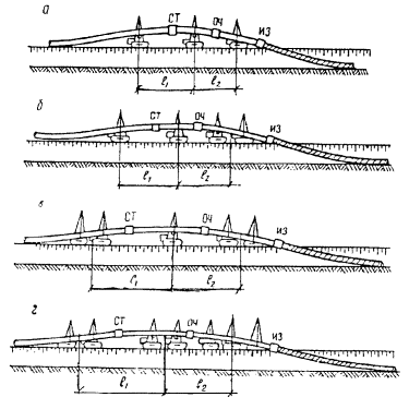 Рис. 9. Схемы расположения трубоукладчиков и машин в изоляционно-укладочной колонне при совмещенном способе производства работ для трубопроводов различных диаметров; а - 529-820 мм; б - 1020 мм; в - 1220 мм; г - 1420 мм; ОЧ - очистная машина; ИЗ - изоляционная машина; СТ - сушильная установка; l1, l2 - расстояния между трубоукладчиками и группам трубоукладчиков