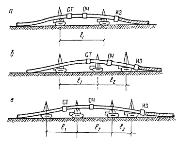 Рис. 12. Схемы расположения трубоукладчиков и машин в изоляционно-укладочной колонне для трубопроводов различных диаметров: а - 529 мм; б - 720-1020 мм; в - 1220-1420 мм; ОЧ - очистная машина; ИЗ - изоляционная машина; СТ - сушильная установка; l1, l2, l3 - расстояния между трубоукладчиками.