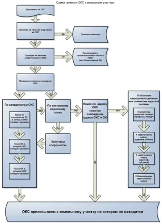 Методические рекомендации Данные методические рекомендации описывают технологию привязки информации об объектах капитального строительства (далее - ОКС) к земельным участкам при внесении сведений об ОКС в автоматизированную информационную систему "Государственный кадастр недвижимости" (далее - АИС ГКН). Данные методические рекомендации являются временными, их требования применяются при проведении работ по переводу сведений архивов организаций технической инвентаризации в электронный вид и их внесению в базы данных (далее - БД) АИС ГКН. При поступлении документов по объекту капитального строительства для привязки его к земельному участку (далее - ЗУ) необходимо выполнить следующие действия: 1. Проверить в БД АИС ГКН на наличие такого же ОКС, если данные об ОКС уже существуют в БД, то это означает, что по нему пришли изменения, которые необходимо внести в БД. Привязку ОКС проводим в случае, если изменились адрес или координаты объекта. 2. Если такого ОКС не оказалось в БД, то осуществляется проверка на наличие "родительского" ОКС в БД (например: пришли сведения о части здания, помещения и др.), используя инвентарный номер, и если такой объект найден, то устанавливаем связь с "родительским" ОКС. Если не находим "родительский" ОКС, то осуществляется привязка ОКС к ЗУ другими способами, приведенными ниже. 3. Привязка ОКС по координатам должна осуществляться в следующей последовательности: 3.1. Осуществляется поиск ЗУ по координатам, в который ОКС попадает целиком. 3.2. Если не удалось привязать ОКС к ЗУ, то осуществляется поиск кадастрового квартала (далее - КК), в который ОКС попадает целиком. 3.3. Если не удалось привязать ОКС к КК, то осуществляется поиск кадастрового района (далее - КР), в который ОКС попадает целиком. 4. Привязка ОКС к ЗУ с использованием векторного адресного плана (далее - ВАП), осуществляется в том случае, если не удалось привязать ОКС по координатам или координаты отсутствуют. Производится поиск объекта ВАП (полигона) с адресом соответствующему адресу ОКС. В случае если такой объект ВАП обнаружен, получаем его координаты и привязываем ОКС с полученными координатами к ЗУ, используя п. 3 настоящих методических рекомендаций. 5. Если ОКС не удалось привязать ни по координатам, ни по векторному адресному плану, то осуществляется привязка ОКС по адресу ЗУ. В этом случае адрес ОКС и ЗУ должны полностью совпадать. 6. Привязка ОКС к объектам кадастрового деления по элементам адресной системы должна осуществляться в самую последнюю очередь, в случае если не удалось привязать ОКС способами указанными ранее. Привязка производится в следующей последовательности: 6.1. Осуществляется поиск и привязка ОКС к элементам адресной системы (префиксы КЛАДР - населенный пункт, улица). 6.2. Осуществляется привязка ОКС к объекту кадастрового деления, на основании представленных сведений об объекте и его адресных ориентиров: - к кадастровому району; - к кадастровому округу; - к федеральному кадастровому округу. Технология привязки ОКС к ЗУ приведена на схеме.