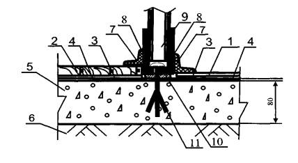 между основанием и антистатическим поливинилхлоридным линолеумом, приклеенным