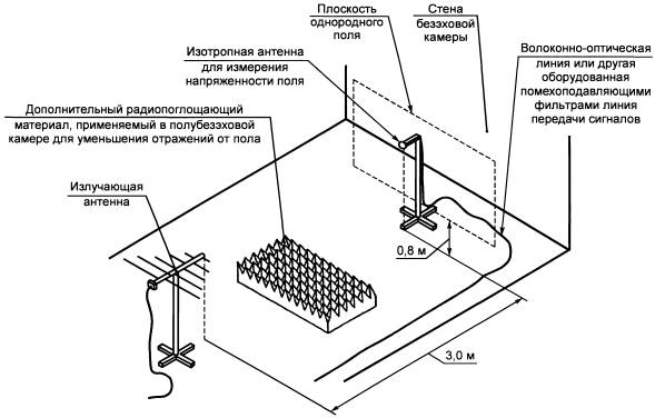 Расположение излучающих антенн и кабелей должно быть зафиксировано как можно точнее. При проведении испытаний антенны и кабели должны быть размещены так же, как и при калибровке поля. Незначительные их смещения оказывают существенное влияние на испытательное поле.