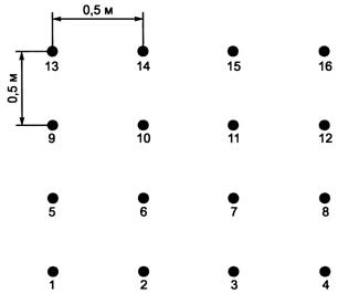 Если в полосе частот от 1 до 6 ГГц требования к однородности испытательного поля, установленные в настоящем разделе, могут быть выполнены только на частотах не выше конкретной частоты, например если ширина диаграммы направленности излучающей антенны недостаточна для облучения всей поверхности ИТС, то для более высоких частот применяют метод независимых окон по приложению И. Калибровку поля в безэховых и полубезэховых камерах следует проводить с помощью измерительной установки, приведенной на рисунке 7. Калибровку всегда следует проводить при немодулированной несущей для горизонтальной и вертикальной поляризаций испытательного поля в соответствии со значением шага изменения частоты, указанным в разделе 8. Значение напряженности поля при калибровке должно быть по крайней мере в 1,8 раза больше значения напряженности поля, которое будет воздействовать на ТС при проведении испытаний, чтобы обеспечить прохождение через усилители модулированного сигнала в отсутствие насыщения. Если обозначить напряженность поля при калибровке через Еc, то напряженность испытательного поля Et не должна превышать Еc/1,8. Примечание - Могут быть использованы другие методы предотвращения насыщения. Ниже приведены два метода калибровки испытательного поля. Измерительная сетка, состоящая из 16 точек измерения (размеры плоскости однородного поля 1,5×1,5 м), рассмотрена в качестве примера. При правильном применении оба метода обеспечивают одинаковую однородность испытательного поля. 6.2.1 Метод калибровки при постоянной напряженности поля Постоянную напряженность испытательного поля в плоскости однородного поля устанавливают с использованием калиброванной измерительной антенны (датчика) последовательно на каждой из частот в каждой из 16 точек измерительной сетки (см. рисунок 4), используя значение шага частоты, указанное в разделе 8, путем регулирования мощности сигнала, подаваемого на излучающую антенну. Мощность сигнала, подаваемого на излучающую антенну, измеряют с помощью установки по рисунку 7. Калибровку проводят при горизонтальной и вертикальной поляризации испытательного поля. Значения подаваемой мощности, дБ(мВт), регистрируют в 16 точках измерения. Процедура калибровки заключается в следующем: а) антенну (датчик) для измерения напряженности поля размещают в одной из 16 точек измерительной сетки (см. рисунок 4) и устанавливают минимальную частоту испытательного сигнала в полосе частот, установленной для испытаний (например 80 МГц); б) подают на излучающую антенну сигнал такой мощности, чтобы полученная напряженность поля была равна требуемой напряженности поля при калибровке Еc. Значение подаваемой мощности регистрируют; в) увеличивают частоту испытательного сигнала генератора на 1 % предыдущего значения частоты; г) повторяют шаги по перечислениям б) и в) до тех пор, пока следующая частота не превысит верхнего значения полосы частот, установленной для испытаний. Затем повторяют процедуру шага по перечислению б) на частоте, равной верхнему значению полосы частот испытаний (например 1 ГГц); д) повторяют шаги по перечислениям а) - г) для каждой из оставшихся 15 точек измерительной сетки. На каждой частоте: е) распределяют 16 значений подаваемой на антенну мощности в порядке возрастания; ж) начиная с наибольшего значения подаваемой мощности п