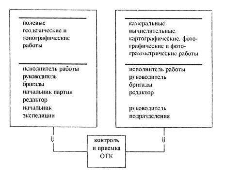 1.3.2. Задачами контроля всех видов работ являются: - проверка соответствия процессов, а также результатов выполненных работ и их оформления требованиям технических проектов и действующих нормативных актов; - выявление степени завершенности работ; - проверка полноты использования геодезических, аэрофотосъемочных, картографических и справочных материалов; - предоставление объективных данных для оценки качества работ; - предупреждение брака в работе, оказание необходимой помощи при выполнении работ в установленные сроки и с соблюдением установленных требовании; проверка состояния приборов и вспомогательных принадлежностей, правильности их эксплуатации и хранения. 1.3.3. На предприятии, выполняющем ГТКР, контроль, осуществляет персонал предприятия (см. рис. 1) и отделы технического контроля (ОТК) или технические отделы изысканий (там, где ОТК не предусмотрен). 1.3.4. Расходы на все виды контроля должны быть предусмотрены сметами технических проектов и производственными заданиями. 1.4. Приемка ГТКР (продукции ГТКР)1.4.1. Основной задачей внутриведомственной приемки ГТКР является принятие решения о соответствии ее фактических параметров (объема, точности, первичных данных / документов и т.д.) техническим документам предприятия, по которым происходит сдача-приемка продукции. В зависимости от вида производства это могут быть: - технические условия или документ их заменяющий в соответствии с ЕСКД; - технический проект или техническое предписание, - нормативно-технические акты по таблице 1. 1.4.2. Приемка продукции происходит на основе приемочного контроля, но может базироваться и на результатах ранее выполненных процедур контроля; эти результаты оформляют, в случае необходимости, как данные приемочного контроля. 1.4.3. На основании положительного решения о приемке работ осуществляется оплата ГТКР. 1.4.4. На предприятии, выполняющем ГТКР, приемку готовой продукции, осуществляют отделы технического контроля (ОТК) или технические отделы изысканий (там, где ОТК не предусмотрен). 1.4.5. На приемку в ОТК предъявляют только готовую продукцию или объект в целом, документация на которые должна быть оформлена и скомплектована в соответствии с требованиями НД (ТП, ТУ). 2. СИСТЕМА ТЕХНИЧЕСКОГО КОНТРОЛЯ ГТКР И ПРИЕМКИ ПРОДУКЦИИ2.1. Схема контроля2.1.1. Основные понятия системы технического контроля ГТКР и приемки продукции (далее - система контроля и приемки работ) приведены в Приложении 1, программы контроля распространенных ГТКР - в Приложении 2. Схема контроля и приемки работ, принятая в производственной геодезической и картографической деятельности, предусматривает непрерывный контроль работ и приемку последовательно по всем звеньям структуры предприятия от исполнителя до ОТК (рис. 1). 2.1.2. Контроль работ в подразделении проводят также инспектирующие лица предприятий и представители заказчика (по согласованию).