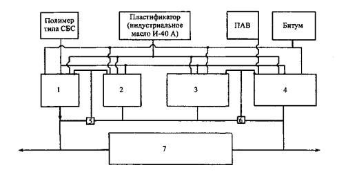 Рис. 1. Технологическая схема приготовления ПБВ: 1, 2 - емкости для приготовления РП и БРП; 3, 4 - емкости для приготовления ПБВ; 5, 6 - диспергаторы (марки sifer); 7 - накопительная и раздаточная емкость. Насосы и краны не указаны, механические мешалки не обозначены, но предусмотрены во всех емкостяхНеобходимо обеспечить весовое дозирование всех компонентов РП и БРП. Отпуск ПБВ Потребителю рекомендуется осуществлять через сито с сеткой № 07, при этом должна быть обеспечена необходимая мощность тепловой машины для быстрого нагрева компонентов в емкостях от 80 до 160°С. Предлагаемая схема направлена на повышение производительности установки и усовершенствование процессов зачистки от полимеризата без прекращения работы. 6.7. Для приготовления ПБВ можно использовать любую обогреваемую емкость, оборудованную механической мешалкой, в том числе битумные котлы и реакторы бескомпрессорных установок типа Т-309. Площадь горловины емкостей для приготовления и хранения РП, БРП, ПБВ должна быть не менее 0,3 м2. Крышка емкости должна открываться полностью, обеспечивая свободную загрузку материалов и возможность осмотра дна и стенок емкости. На крышке необходимо предусмотреть небольшие герметично закрывающиеся клапаны для замера уровня и отбора проб сырья, а также готового ПБВ. Пластификатор, битум или сырье загружают в емкость не более чем на 0,7 ее объема. 6.8. Полимерно-битумные вяжущие, РП, БРП считаются однородными, если на стеклянной палочке, извлеченной из горячего материала (при температуре приготовления), не обнаружено комочков, крупинок, сгустков, а материал стекает с нее непрерывной струей. При этом остаток на сите с металлической сеткой № 07 не должен превышать 0,02% от массы образца. ПБВ, РП и БРП следует отпускать Потребителю через съемное сито с металлической сеткой № 07 (ГОСТ 6613-86), вмонтированной в трубопровод накопительной и раздаточной емкостей. Допускается применять только однородные материалы. 6.9. Дозировочные устройства, битумопроводы, насосы, смесители, используемые при приготовлении ПБВ, должны быть обеспечены системой паро-, масло- или электрообогрева. Все системы до начала работы прогревают. 6.10. ПБВ можно приготавливать как на НПЗ, так и на АБЗ с использованием необходимого дополнительного и имеющегося оборудования в соответствии со специально разработанным и утвержденным в установленном порядке технологическим регламентом, ориентировочное содержание которого приведено в приложении Б. Способ приготовления битумов с добавкой ПАВ Предлагаемые ПАВ с активными малеиновыми группами, в частности «Т-1», позволяют обеспечить требуемую адгезию товарных битумов с применяемыми минеральными материалами. Битум с ПАВ должен удовлетворять требованиям ГОСТ 22245-90, а кроме того, обеспечивать сцепление со щебнем и песком кислых пород в соответствии с нормой «выдерживает по контрольному образцу № 2». 6.11. Введение ПАВ в битум может осуществляться как на АБЗ, так и на предприятиях, изготавливающих и поставляющих битум дорожно-строительным организациям, - НПЗ, битумным базам, локальным битумным заводам. 6.12. При приготовлении битума с добавкой ПАВ используются механические перемешивающие устройства (мешалки). Битум после выпаривания из рабочего котла закачивается в емкость для приготовления его смеси с ПАВ (температура битума в емкости не дол