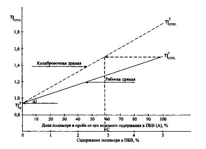 Вычисляют ηсотн и η5отн по уравнениям (10) и (11) ηсотн = 100tgα + ηуо = 100·0,0060 + 0,9242 = 1,5242, η5отн = 3,6984 - 1,9312ηуо = 3,6984 - 1,9312 0,9242 = 1,9136. Содержание полимера в ПБВ определяют по формуле (12)
