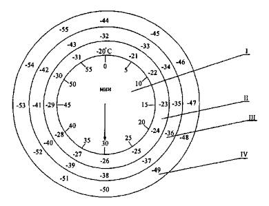 Рис. 3. Температурно-временная схема многократного сгибания образца: 1 - минутная шкала секундомера; II, III, IV - температура, соответствующая времени по шкале секундомера Рис. 3 приведен с целью облегчения записи процесса испытания: при показателе 0 мин принята температура начала многократного нагружения, равная минус 20°С; при 5 мин - минус 21°С; при 10 мин - минус 22°С и т.д. За температуру хрупкости вяжущего после многократного нагружения принимают температуру образования на поверхности вяжущего глубокой трещины. Одновременно по показаниям секундомера рассчитывают число циклов нагружения до образования глубокой трещины, добавив число циклов растяжения от 0°С до температуры начала нагружения. Результаты испытания включают в себя следующие показатели: 1) Тnxр - температура образования рисунка типа ряби или микротрещины, °С. 2) n - число циклов нагружения до образования микротрещины. 3) Качественное состояние вяжущего после n сгибаний при Тnxр (рябь или микротрещины). 4) ТNxр - температура хрупкости после многократного нагружения образца до образования глубокой трещины, °С. 5) N - число циклов нагружения до образования глубокой трещины. 13.12.4. Обработка результатов 13.12.4.1. За температуру хрупкости после многократного нагружения принимают среднее арифметическое значение двух определений, округленное до целого числа. 13.12.4.2. Сходимость Два результата определения, полученные одним лаборантом на одном и том же аппарате и пробе вяжущего, признаются достоверными (при доверительной вероятности 95%), если расхождение между ними не превышает 3°С. 13.12.4.3. Воспроизводимость Два результата испытания, полученные разными лаборантами, в двух разных лабораториях на одной и той же пробе вяжущего, признаются достоверными (при доверительной вероятности 95%), если расхождения между ними не превышают 4°С. 13.12.4.4. Допускаемые точностные характеристики действительны до температуры минус 60°С. 13.12.4.5. Смеси полимерасфальтобетонные и полимерасфальтобетон испытывают стандартными методами по ГОСТ 12801-98, а также дополнительно нестандартными, такими, как: глубина вдавливания штампа и эластичность. 13.13. Определение глубины вдавливания штампаСущность метода заключается в определении максимального погружения металлического штампа площадью 5 см2 в образец полимерасфальтобетона при нагрузке на штамп 52,5 кгс. 13.13.1. Аппаратура Пресс с механическим приводом, способный обеспечить нагрузку 52,5 кгс; штамп металлический диаметром 2,52 см (площадь 5 см2); металлическая форма диаметром и высотой 7 см для изготовления образцов полимерасфальтобетона; сосуд вместимостью 3-5 л для термостатирования образца полимерасфальтобетона; термометр стеклянный с ценой деления 1°С по ГОСТ 400-80; стойка гибкая типа МС-29 по ТУ 2-034-668-83; индикатор часового типа с ценой деления 0,01 мм для измерения деформаций до 10 мм; резиновая груша. 13.13.2. Подготовка к испытанию Изготовленный по ГОСТ 12801-98 образец полимерасфальтобетона извлекают из формы, охлаждают не менее 3 ч. Перед испытанием образцы термостатируют при температуре 50±2°С и выдерживают в течение 1 ч в воде. 13.13.3. Проведение испытания Сосуд для термостатирования с образцом помещают в центре нижней плиты пресса. В течение всего испытания температура воды в сосуде поддерживается 50±2°С. На поверхность образца устанавливают металлический штамп, затем верхнюю плиту 