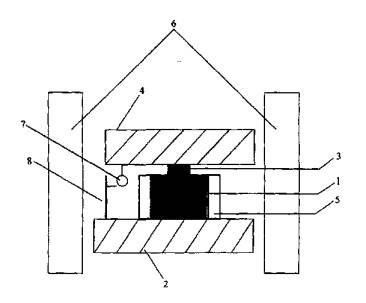 Рис. 4. Схема испытания на глубину вдавливания штампа: 1 - образец; 2, 4 - нижняя и верхняя плиты пресса; 3 - штамп круглый; 5 - емкость для термостатирования; 6 - штанги; 7 - индикатор деформации; 8 - стойка 13.13.5. Упрощенный метод определения глубины вдавливания штампа Метод заключается в определении глубины погружения штампа в полимерасфальтобетон в условиях ограничения его перемещения (расширения) в горизонтальном направлении. 13.13.5.1. Аппаратура Пресс с механическим приводом, способный обеспечить нагрузку 52,5 кгс; штамп металлический диаметром 2,52 см (площадь 5 см2); форма диаметром и высотой 7 см для изготовления образцов полимерасфальтобетона; сосуд вместимостью 3-5 л для термостатирования образца полимерасфальтобетона в форме; термометр стеклянный с ценой деления 1°С по ГОСТ 400-80; стойка гибкая типа МС-29 по ТУ 2-034-668-83; индикатор часового типа с ценой деления 0,01 мм для измерения деформаций до 10 мм; резиновая груша. 13.13.5.2. Подготовка к испытанию Изготовленный по ГОСТ 12801-98 образец полимерасфальтобетона после удаления вкладышей, не извлекая из формы, охлаждают не менее 3 ч. В сосуд для термостатирования образца заливают воду при 50°С выше уровня поверхности образца в форме и выдерживают в нем при температуре воды 50± 1°С в течение 1 ч. 13.13.5.3. Проведение испытания Сосуд для термостатирования помещают в центре нижней плиты пресса. В течение всего испытания температура воды в сосуде поддерживается 50±1°С. На поверхность образца устанавливают металлический штамп, затем опускают верхнюю плиту и останавливают не доходя до уровня поверхности штампа на 1,5-2 мм. Для измерения деформации индикатор, прикрепленный к стойке, размещают таким образом, чтобы подвижная часть его ножки касалась верхней плиты пресса. После этого включают электродвигатель и начинают нагружать образец через штамп (рис. 4). Когда стрелка силоизмерителя пресса отклонится от пулевой точки, электродвигатель отключают, устанавливают стрелку индикатора на ноль и продолжают нагружение на штамп. Нагрузку на штамп задают постоянную (52,5 кг) и выдерживают в течение 30 мин. По истечении времени испытания фиксируют показания индикатора. Температуру образца 50±1°С поддерживают во время испытания добавлением воды, избыток которой отбирают резиновой грушей. 13.13.5.4. Обработка результатов За окончательный результат принимают среднее арифметическое значение показателя индикатора (мм) после испытания трех параллельных образцов. 13.14. Определение эластичности полимерасфальтобетонаСущность метода определения эластичности полимерасфальтобетона заключается в определении количества циклов нагружений образца до его разрушения. 13.14.1. Аппаратура Пресс механический или гидравлический по ГОСТ 28840-90 с нагрузкой от 50 до 100 кН (5-10 тс) с силоизмерителями, обеспечивающими погрешность не более 2% измеряемой нагрузки; термометр химический ртутный стеклянный с ценой деления 1°С по ГОСТ 400-80; сосуд для термостатирования образцов вместимостью 3-8 л (в зависимости от размера и количества образцов). 13.14.2. Подготовка к испытанию Для испытания готовят шесть образцов полимерасфальтобетона в соответствии с ГОСТ 12801-98. Затем для трех образцов определяют предел прочности при сжатии при (50±2)°С в соответствии с ГОСТ 12801-98. 13.4.3. Проведение испытания Эластичность образцов определяют на прессах с механическим приводом при ско