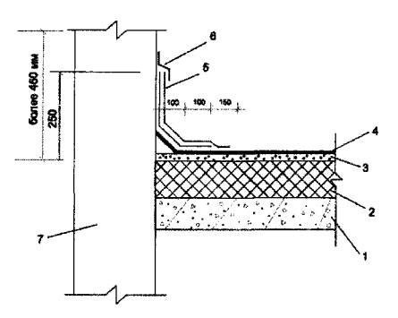 1 - железобетонная плита; 2 - утеплитель; 3 - цементно-песчаная стяжка; 4 - основной водоизоляционный ковер; 5 - дополнительные слои; 6 - фартук из оцинкованной стали или рулонного материала; 7 - парапет, стена или труба.
