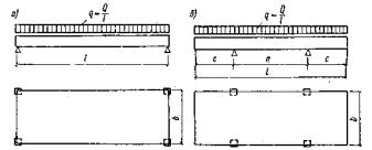 Рис.1. Расчетные схемы поддона 4.2. Коэффициент W определяется в зависимости от расположения опор (рис.1): при опорах по краям W = t¢(1 + yn); (4) при опорах, смещенных к середине