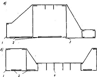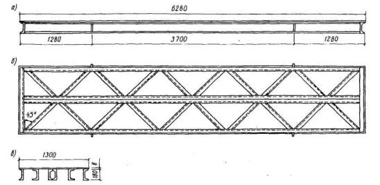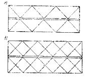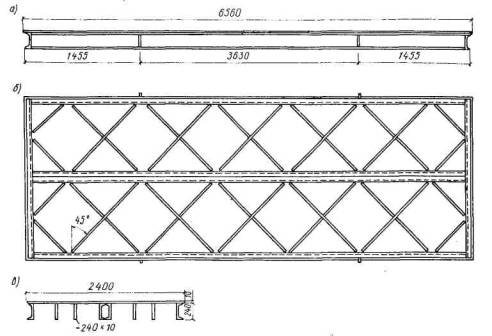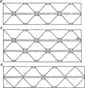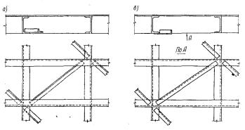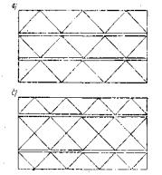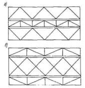 решеток 8.3. В зависимости от положения первых от торцов узлов пересечения раскосов возможны две схемы: одинарная решетка с узлами пересечения раскосов под обшивкой (см. рис.5,а) и на торцевых балках (см. рис.5,б). При двойной решетке первой схеме соответствует один узел на торцевых балках (см. рис.6,а), второй схеме - два узла (см. рис.6,б). 8.4. Помимо одинарной и двойной решеток без внутренних продольных балок (см. рис.5 и 6), существуют схемы с внутренними продольными балками: одной (рис.7), двумя (рис.8) и тремя (рис.9).