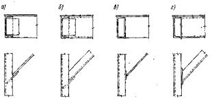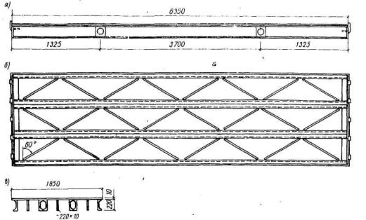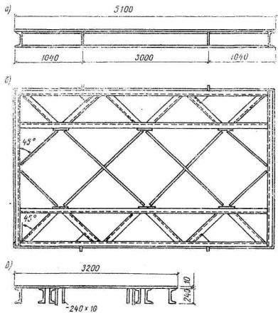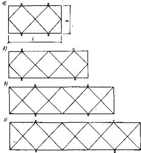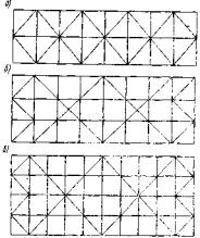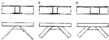 Рис.13. Схемы раскосной решетки с раздвинутыми раскосами 9.5. В отдельных случаях допускается раздвижка раскосов из полосы, если по каким-либо соображениям раскосы нежелательно располагать под углом, меньшим или большим 45° по всей длине или на части длины поддона. 9.6. При конструировании раскосы следует размещать, начиная от торцов; необходимые сбивки в шаге раскосов, в том числе и раздвижку раскосов рекомендуется выполнять в средней зоне (см. рис.13,в). 9.7. Места расположения устройств для подъема (осей колес, опорных плит) следует совмещать с узлами сопряжения раскосов и наружных продольных балок. Для форм шириной до 2 м при достаточно мощных наружных продольных балках и расчетной нагрузке на опорный узел, равной или меньшей 2 т, соблюдение этого требования не является обязательным. 9.8. Для удовлетворения требования п.9.7 при рекомендуемом смещении
