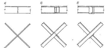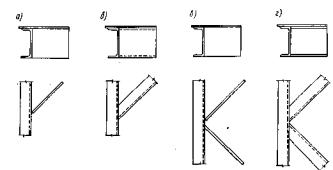 Рис.19. Узел примыкания раздвинутых раскосов к продольной балке 10.7. При раздвинутых раскосах рекомендуется, чтобы сходящиеся узле швеллеры были обращены друг к другу стенкой и полкой (см. рис.19,в). В этом случае отпадает необходимость в подгонке длины вставки по ширине зазора. 10.8. Раскосы из уголков, дополняющие каркас из продольных и поперечных балок, следует приваривать к нижним полкам швеллеров или к стенке в уровне нижней полки швеллера (рис.20,а).
