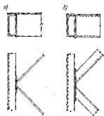 6.7. Момент инерции поддона с комбинированной решеткой, в котором каркас из продольных и поперечных балок дополняется раскосами из уголков, расположенных в уровне нижней полки балок (см. разд.8 настоящих Рекомендаций), а сам поддон имеет сложное очертание, подсчитывается по формуле (7). 6.8. При определении момента инерции поддона по п.6.7 входящие в формулу (7) параметры dс и S' подсчитываются по приведенной толщине нижней обшивки dн; в формулу (8) вводят коэффициент B = 0,5 и ширину b', равную ширине поддона. 7. ОБЩИЕ ПРИНЦИПЫ КОНСТРУИРОВАНИЯ РАСКОСНОЙ РЕШЕТКИ7.1. Каркасы поддонов с раскосной решеткой конструируются из наружных продольных и торцевых балок и внутренней решетки, образуемой диагонально расположенными балками (раскосами). 7.2. Раскосы рекомендуется располагать таким образом, чтобы они образовывали полные перекрестные связи и имели высоту, равную высоте наружных балок. Примечание. Полной называется перекрестная связь, в которой оба раскоса (каждый из одного элемента или при наличии внутренних продольных балок из нескольких элементов) проходят по всей ширине поддона и упираются в наружные продольные балки. 7.3. В поддонах шириной до 2 м при двух внутренних продольных балках коробчатого сечения (из двух швеллеров, обращенных друг к другу полками) допускается отсутствие полных перекрестных связей, благодаря чему обеспечивается симметричное расположение узлов примыкания раскосов по длине наружных балок. 7.4. Схема раскосной решетки принимается в зависимости от вида нагрузки, передаваемой на поддон, от размеров поддона в плане, от требований технологии, обусловленных необходимостью установки и крепления поддонов на постах технологической линии, от сечения раскосов. Классификация схем раскосной решетки приведена в разд.8, а указания по выбору схемы решетки содержатся а разд.9 настоящих Рекомендаций. 7.5. Рекомендуется принимать раскосы из полосы (см. прил.1 и 2 настоящих Рекомендаций), гнутых неравнополочных уголков по сортаменту НИИЖБ (см. прил.3 настоящих Рекомендаций) и прокатных швеллеров (ГОСТ 8240-72). Помимо приведенных в прил.1-3 профилей, допускается в качестве раскосов применять полосы по ГОСТ 103-76 и ГОСТ 82-70, а также гнутые неравнополочные уголки из листа толщиной 4-8 мм и с горизонтальной полкой, ширина которой может быть меньше указанной в сортаменте НИИЖБ (см. прил.3 настоящих Рекомендаций). 7.6. Выбор сечения раскоса (полоса, гнутый неравнополочный уголок, швеллер) производится с учетом требуемой жесткости конструкции на кручение и изгиб, характера загружения формы, наличия соответствующих профилей и оборудования для рубки неравнополочных уголков и швеллеров под углом 45°, схемы балочной решетки и т.п. 7.7. Наибольшая жесткость на кручение (для принятой схемы балочной решетки) достигается при использовании в качестве раскосов швеллере в и неравнополочных уголков. При раскосах из швеллеров одновременно обеспечивается максимальная жесткость на изгиб. 7.8. Оптимальным раскосом следует считать гнутый неравнополочный уголок по сортаменту НИИЖБ (см. прил.3 настоящих Рекомендаций). Поскольку централизованный выпуск этих профилей в настоящее время не организован, допускается применять гнутые профили, изготовленные непосредственно на заводе-изготовителе форм. 7.9. Швеллер в качестве раскоса рекомендуется применять в первую очередь 