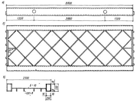 Рис.20. Крепление раскосов из уголков к балкам каркаса поддона Раскосы, являющиеся элементами усиления существующей конструкции, следует приваривать к швеллерам снизу, удаляя предварительно вертикальную полку уголков на участках примыкания к швеллерам (рис.20,б). 11. СПЕЦИФИКА КОНСТРУИРОВАНИЯ РАСКОСНОЙ РЕШЕТКИ В ПОДДОНАХ СЛОЖНОГО ОЧЕРТАНИЯ11.1. В поддонах сложного очертания, на которых формуют ребристые изделия, изделия с криволинейными поверхностями и т.п., обычно не удается ограничиться решеткой простейшего типа, и балочный каркас выполняется комбинированным (см. разд.9 настоящих Рекомендаций). 11.2. Причиной усложнения балочного каркаса в поддонах рассматриваемого типа являются разные высоты балок в поперечном и продольном сечениях, необходимость размещения балок по ширине и длине в определенных местах (в соответствии с изменением конфигурации изделия) и большая высота поддона. 11.3. Комбинированный каркас в поддонах, указанных в п.11.1, включает продольные и поперечные балки, дополняемые на всей или части площади поддона раскосами той же высоты из швеллеров, гнутых неравнополочных уголков или полосы) либо раскосами из прокатных уголков; рекомендуется на части площади, неудобной для выполнения раскосной решетки, предусматривать нижнюю обшивку толщиной 4-5 мм с отверстиями в каждой ячейке. 11.4. Раскосы, дополняющие каркас из продольных и поперечных балок, рекомендуется применять при высоте поддона h £ 300 мм (рис.21,а); при большей высоте поддона предпочтение следует отдавать раскосам из расположенных внизу прокатных уголков, обеспечивавших существенное снижение металлоемкости каркаса (рис.21,б).