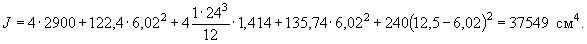 Суммарная вертикальная нагрузка на единицу длины q = 4,12 + 4,8 = 8,92 кг/см. Суммарная вертикальная нагрузка Q = 2700+3000 = 5700 кг. 2. Геометрические характеристики сечения поддона Площадь определяется по формуле (1) F = 4·30,6 + 4·24·1·1,414 + 1·240 = 122,4 + 135,74 + 240 = 498,14 см2. Статический момент инерции относительно оси х, проходящей через центр тяжести швеллеров, составляет Sx = 240·(12 + 0,5) = 3000 см3. Расстояние центра тяжести сечения от оси х равно