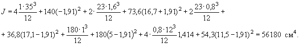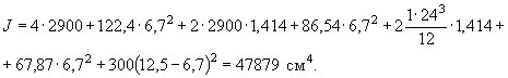 Расстояние оси напряженной арматуры до центра тяжести сечения, когда ось расположена выше обшивки на 2,7 см, составляет e = 4,5 - 1,91 - 2,7 = -0,11 см. Момент инерции на изгиб определяется по формуле (2)