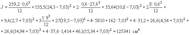 Суммарная вертикальная нагрузка на единицу длины q = 6,72 + 5,68 = 12,4 кг/см. Суммарная вертикальная нагрузка Q = 4100 + 3400 = 7500 кг. 2. Геометрические характеристики сечения поддона Площадь определяется по формуле (1) F =0,6·(259,2 + 2·29,7 + 8)·0,6 + 3·9,1 + 4·40,5 + 4·13,3 + 4·8,15·1,414 = = 155,52 + 35,64 + 9,6 + 27 + 162 + 53,2 + 46,1 = 489,05 см2. Статический момент инерции относительно оси х, проходящей через центр тяжести швеллеров № 30, составляет Sx = 155,52·(39,6 - 15 - 0,3) + 35,64·(39,6 - 15 - 13,8) -