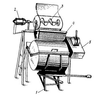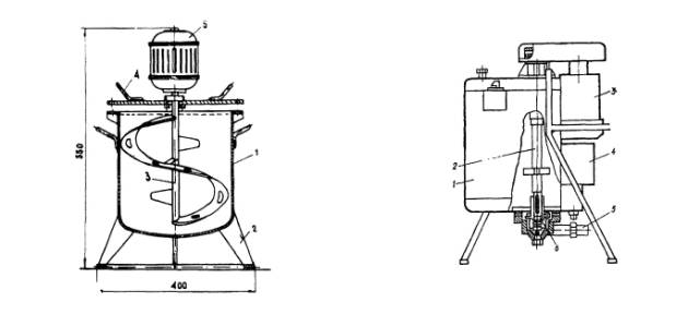 Рис. 2.1. Приспособление для разжижения мастик мешалка (слева), электродрель с крыльчаткой (справа): 1 - станина, 2 - электромотор, 3 - смеситель, 4 - крышка, 5 - пускатель