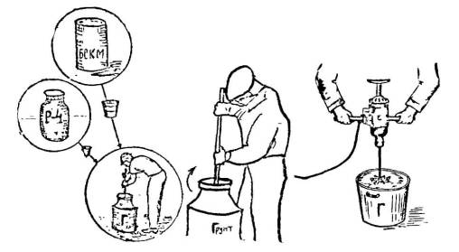 4.7. В качестве переносной тары для мастик используют, как правило, пластмассовые ведра с крышками, которые легко очищаются от остатков мастики. Использование металлических ведер нецелесообразно, так как очистка их затруднительна, а при работе в холодное время года ведра нуждаются в утеплении, для сохранения температуры мастики выше 0°С. 4.8. При нанесении мастик розливом (рис. 4.4) их разравнивают тонким слоем (не более 1,5 мм), используя обрезиненные швабры. Второй слой мастики БСКМ можно наносить только после того, как первый слой отвердел (внешним признаком этого является полный отлип от пальца). На мастику Абрис®Ру после нанесения сразу же необходимо укладывать армирующую основу. 4.9. Перед устройством кровли в зоне водоотводящих воронок полости воронок закрыть мягким материалом (хлопчатобумажные концы, обернутые полиэтиленовой пленкой). По истечении трех суток пробку из воронки извлекают, а скопившуюся вокруг воронки мастику счищают шпателем. 4.10. Наносить мастики целесообразно сначала на все примыкания и сопряжения, как наиболее ответственные части кровли, а затем после освидетельствования на остальную поверхность кровли. Нанесение мастик удобнее выполнять захватками, соответствующими сменной выработке бригады гидроизолировщиков (кровельщиков), чтобы на следующий день на захватке можно было вести последующие работы. 4.11. При устройстве по свежеуложенной мастике БСКМ защитного слоя фольги, алюминиевого порошка и других материалов, работы ведут полосами на ширину, достаточную для укладки материала рабочими, стоящими на слое выдержанной мастики; рецепты декоративно-защитных покрытий определяются проектом или рекомендациями поставщика. 4.12. Для механизированного нанесения вязких мастик практически не пригодны механизмы отечественного производства, так как они не соответствуют технологическим параметрам таких мастик без применения растворителей. 4.13. Для нанесения мастик рационально использовать универсальные передвижные установки типа Грако и Вагнер. Они обеспечивают подачу мастики по шлангам до 150 м в любом направлении, нанесение мастики с помощью сменных насадок (см. рис. 2.5, 2.6). Использование установок Грако и Вагнер способствует не только повышению производительности труда, но и гарантирует высокое качество мастичного покрытия.