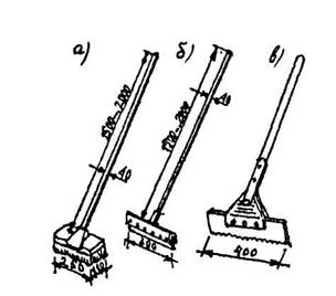 Приспособление для нанесения грунтовки и БСКМ: а) щетка с коротким ворсом, б) гребок-швабра с резиновой вставкой, в) гребенка
