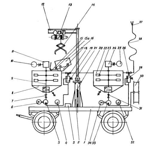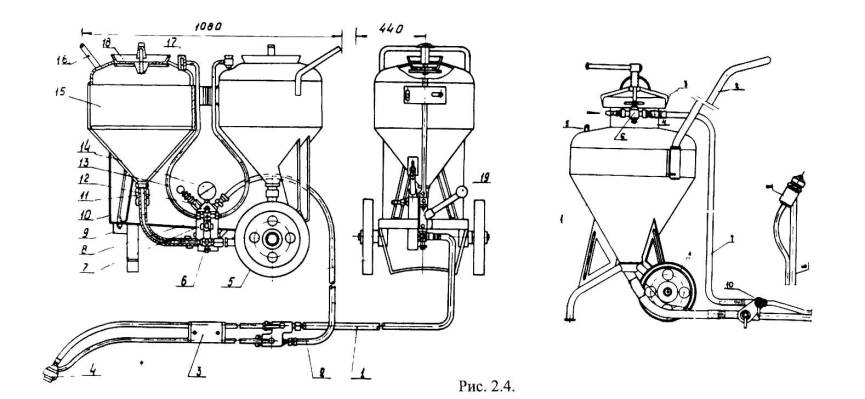 Станция СО-145: 1 - пневмоколесное шасси, 2 - поворотная кран-балка, 3 - компрессор СО-45А, 4, 34 - система трубопроводов с показывающими манометрами, 5, 33 - насосная группа, 6, 32 - электропривод, 7, 31 - сливной кран, 8 - технологическая емкость, 9 - шнековая подпитка* 10, 25 - привод от электродвигателей, 11, 24 - редуктор, 12 - тельферная балка, 13 - электротельфер, 14 - грузозахватное устройство, 15 - заливная горловина, 15а - отверстие бочки для подачи воздуха, 16 - бочка с мастикой, 17 - постель для бочки, 18, 26 - краны, 19, 29 - напорные клапаны, 20 - колонна, 21 - конструктивный элемент поворотной балки, 22 - рабочая емкость, 23 - система перемешивания, 27 - форсунка, 28 - напорный рукав, 30 – барабан 2.2. Для нарезки полотнищ базальтовой и стеклоткани нужно применять остроконечные ножи треугольного сечения (сапожные), а нетканые материалы удобнее нарезать ножницами (рис. 2.8). 2.3. Для перемешивания компонентов вязких мастик применяют электромешалки, которые можно изготовить в строительной мастерской (рис. 2.9, 2.10). 2.4. Для расчистки дефектных швов в сопряжениях плит перекрытия и стен шахт используют электросверлильную машину ИЭ-1013, оборудованную фрезой (рис. 2.11), или шведский эффективный портативный инструмент (рис. 2.12), работать с которым следует по прилагаемой заводом инструкции. 2.5. Для заполнения полости деформационных швов пористыми прокладками применяют специальные ролики (рис. 2.13), которые также просто изготовить в строительной мастерской. 2.6. При необходимости использования в качестве герметиков вулканизующихся герметиков-эластомеров рационально использовать устройство СоюздорНИИ (рис. 2.14), а при незначительных объемах пистолеты (рис. 2.15-2.17). 2.7. Для подачи мастик на высоту применяют машины типа СО-160 и СО-145 (рис. 2.18). 2.8. Для устройства армированных стяжек используют пистолет-напылитель конструкции ЦНИИОМТП, состоящий из электропривода (на базе электрошуруповерта ИЭ-3601), рабочего узла для рубки стекложгута, эжектора и форсунки из дюралюминиевых сменных сопел. Характеристика пистолета: