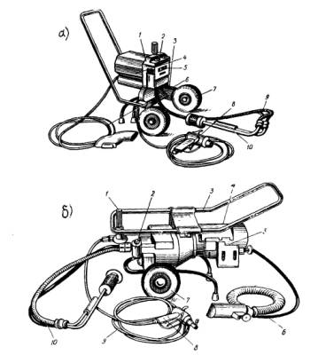 Общие виды агрегатов безвоздушного нанесения: а) - модель 7000Н, б) - модель 2600Н, 1 - фильтр высокого давления, 2 - насос, 3 - тележка с рукояткой, 4 - электродвигатель, 5 - выключатель и защитно-отключающее устройство, 6 - электрокабель, 7 - колеса, 8 - пистолет-распылитель, 9 - рукав высокого давления, 10 - всасывающая система