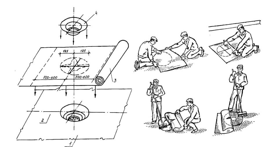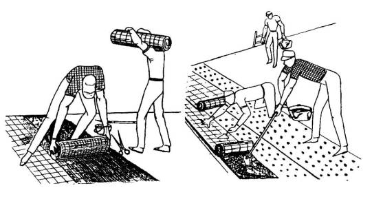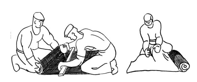 Схемы нанесения приклеивающих мастик и укладка рулонной ткани или нетканки, в т.ч. в водосборном лотке