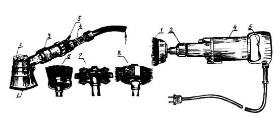 Схема механизмов для очистки крышных конструкций: а - реверсивная пневматическая угловая щетка, б - электродрель, 1, 6, 8 - стальная щетка, 2 - крепление для сменного оборудования, 3 - турбинка, 4 - корпус дрели, 5 - выключатель, 7 - фреза для расчистки швов