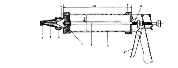 Рис. 2.16. Ручной шприц для нанесения мастик: 1 - лента ворсовая, 2 - мундштук, 3 - гайка, 4 - наконечник, 5 - поршень 6 - стержень, 7 - цилиндр, 8 - крышка, 9 - ручка, 10 - пружина